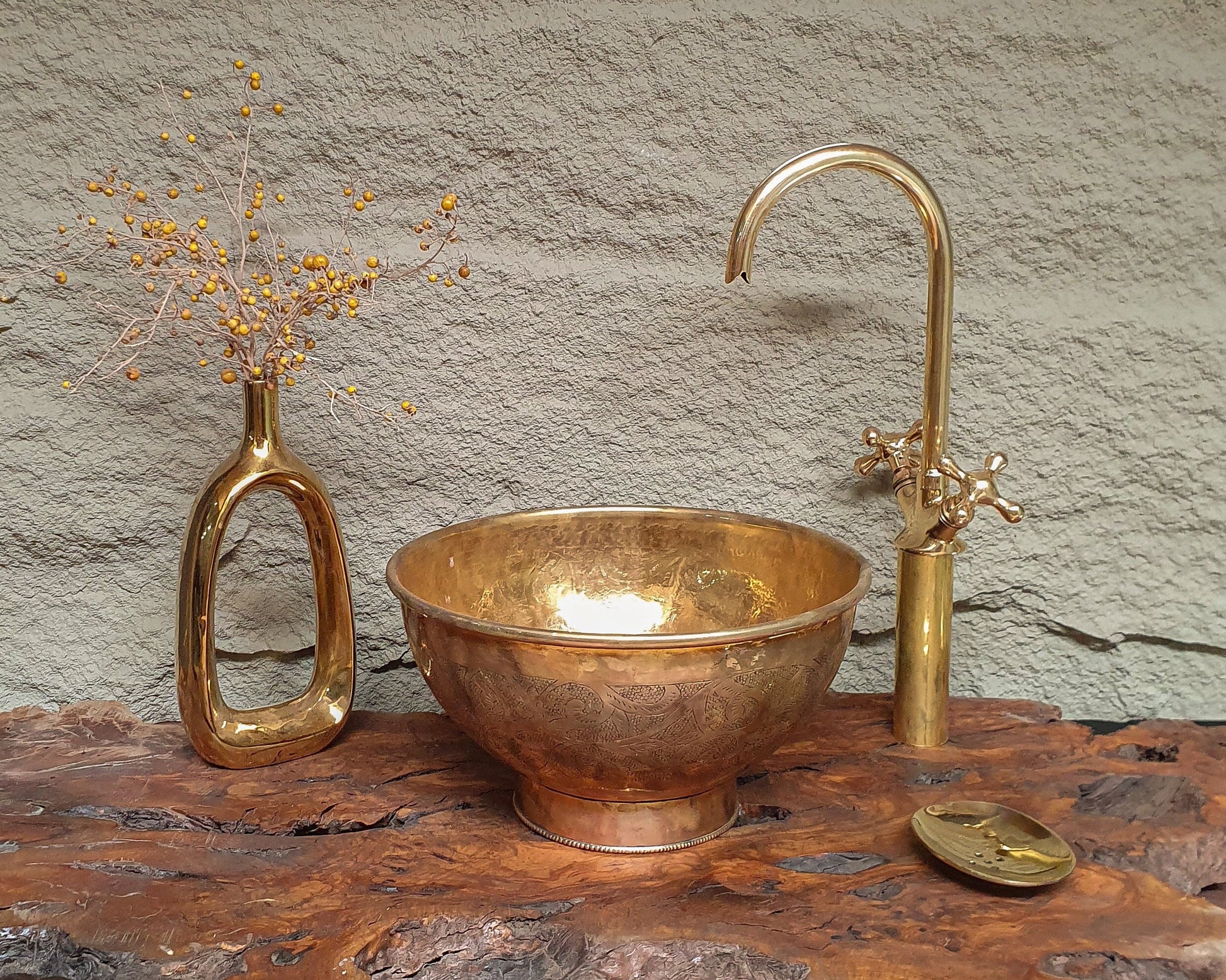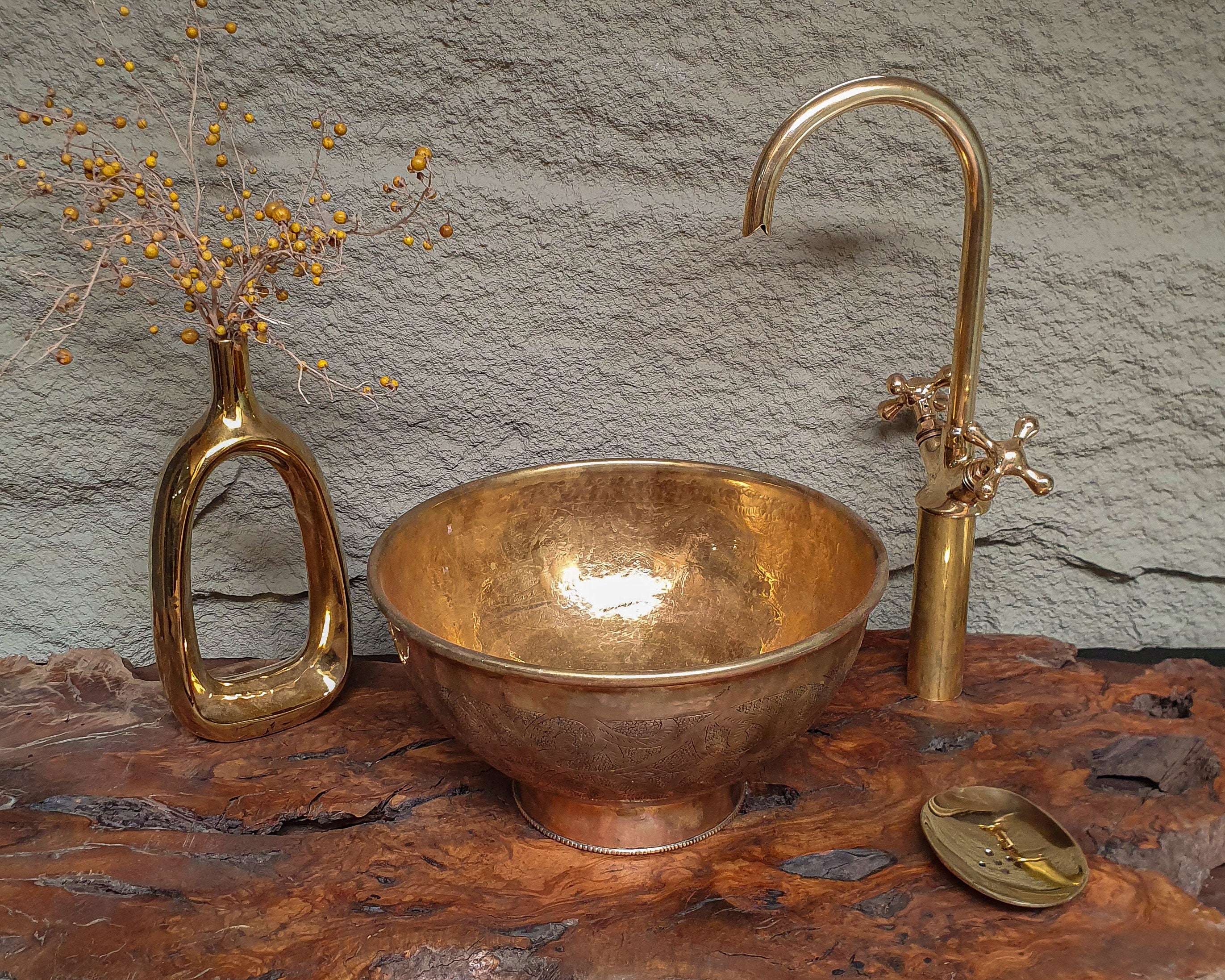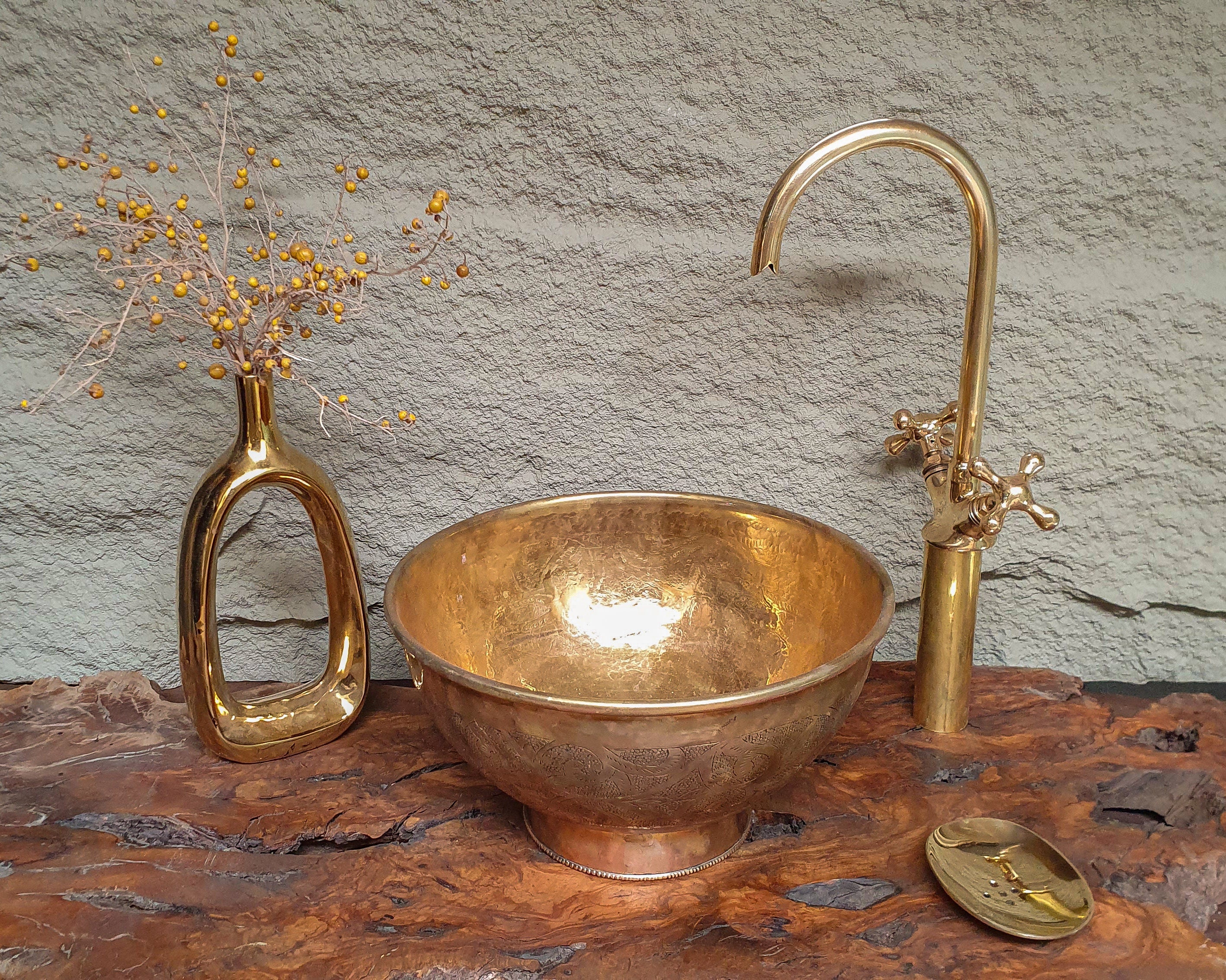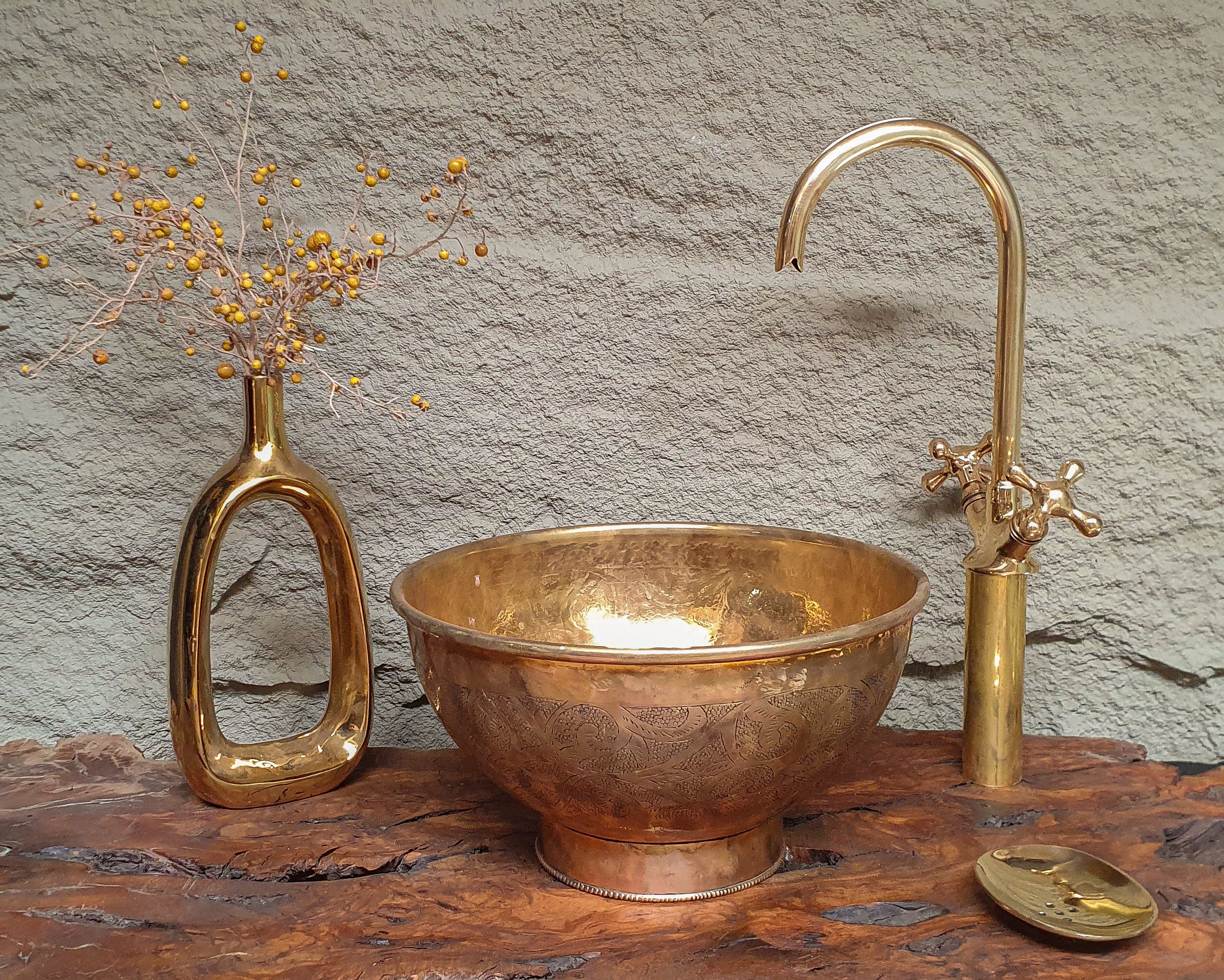 Handcrafted Engraved Brass Vessel Sink, Brass Bathroom Round Basin, Engraved Antique Bathroom Brass sink