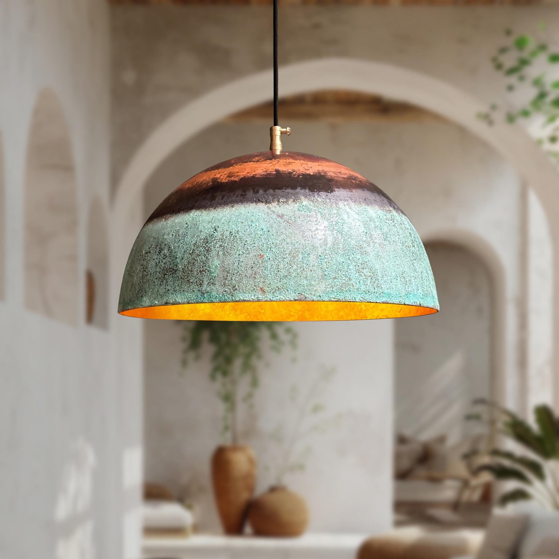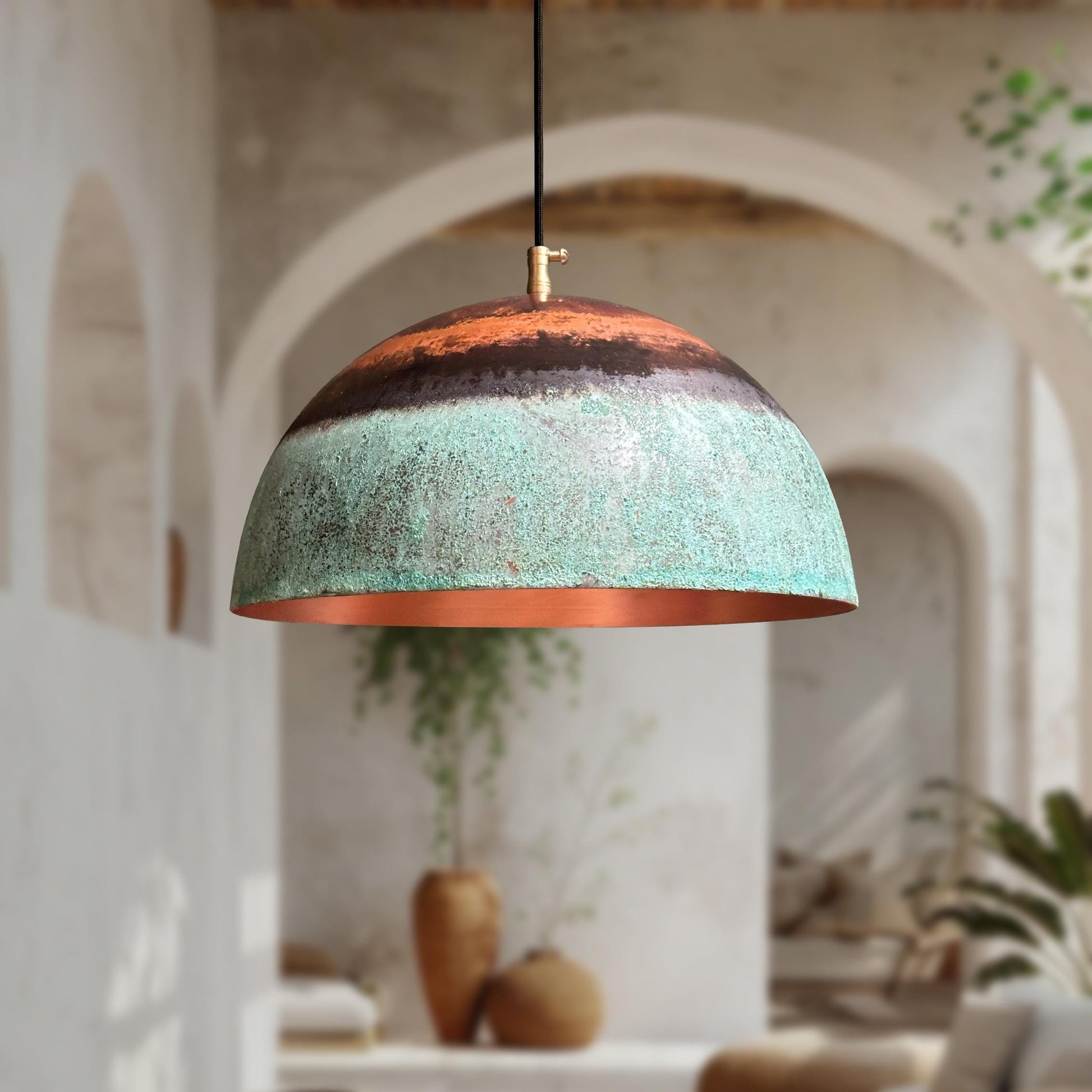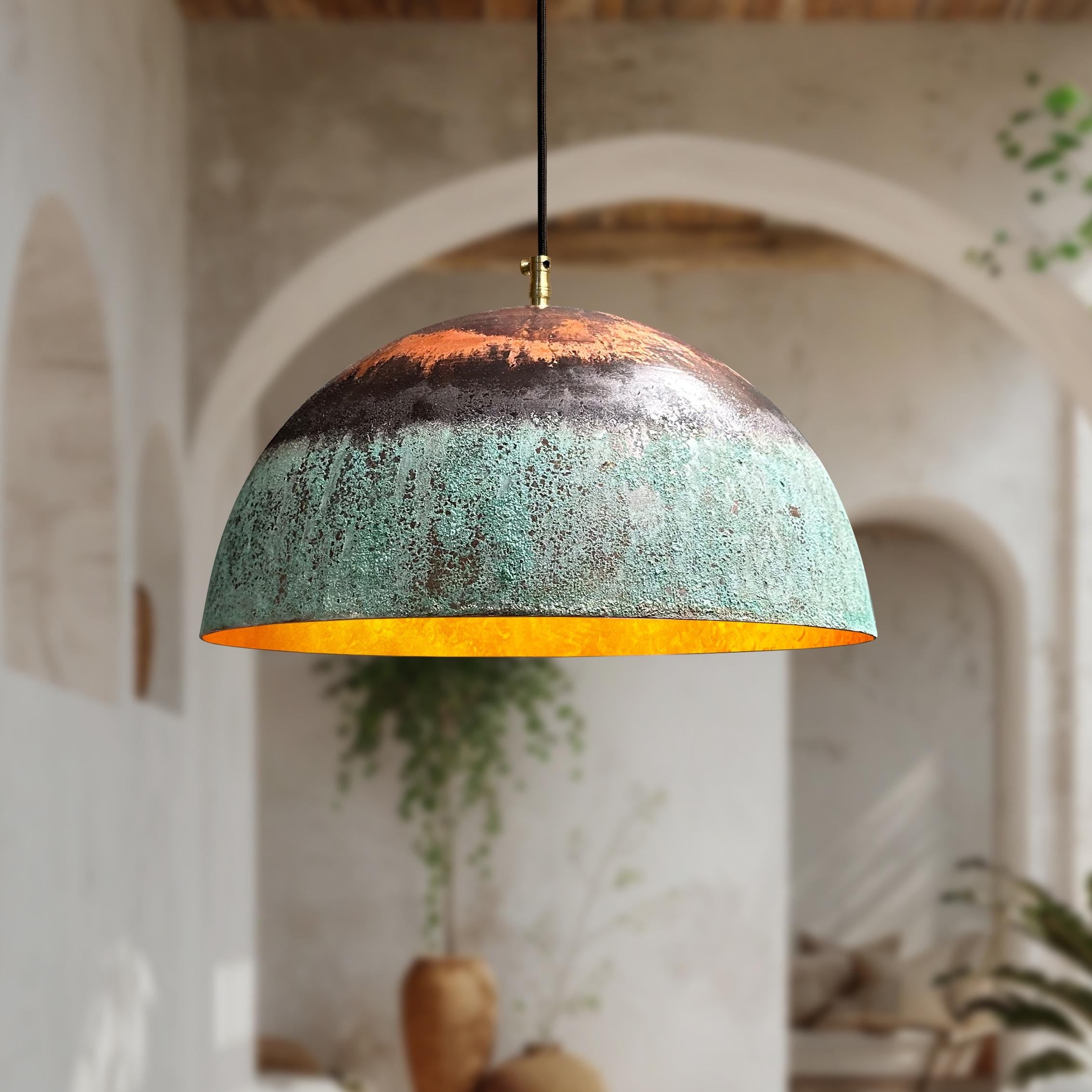 Green Patina Copper Pendant Light – Oxidized Round Rustic Farmhouse Kitchen Fixture
