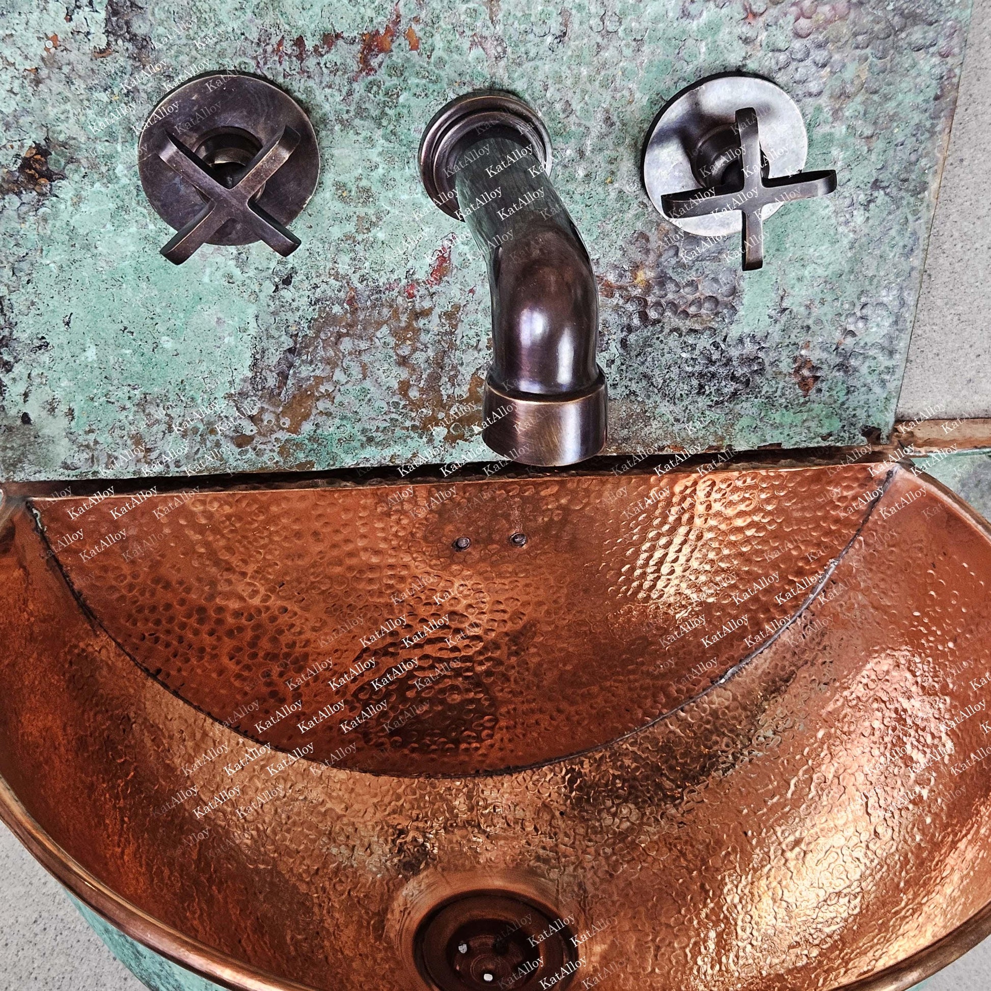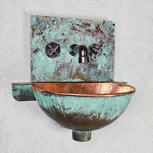 Green Patina Copper Wall Mount Bathroom Sink, Oxidized Wall Mounted Copper Wash Basin, Handmade Patina Copper Hung Basin With Copper Faucet