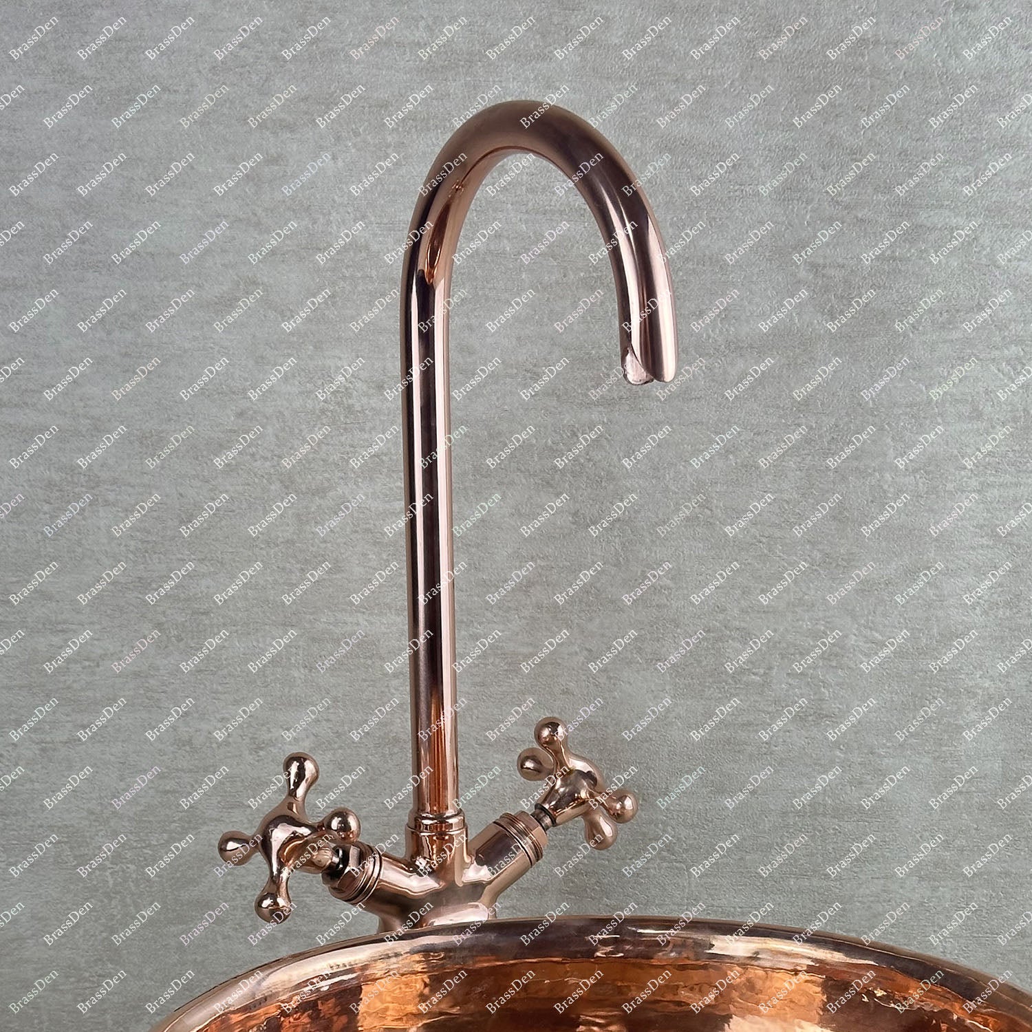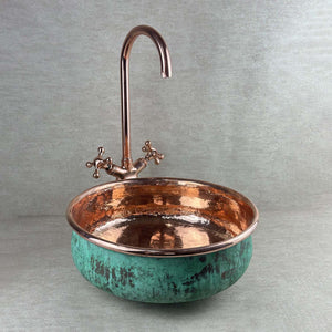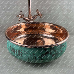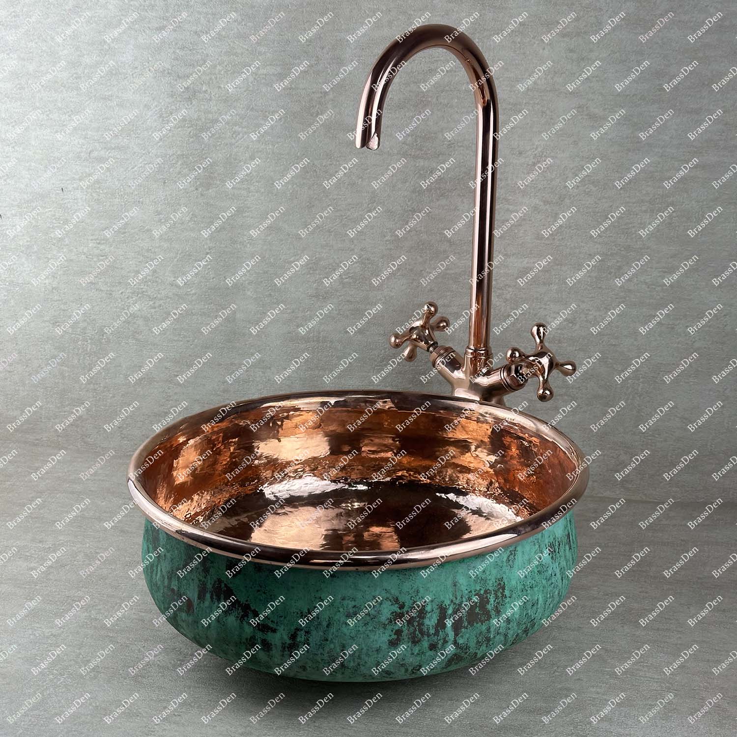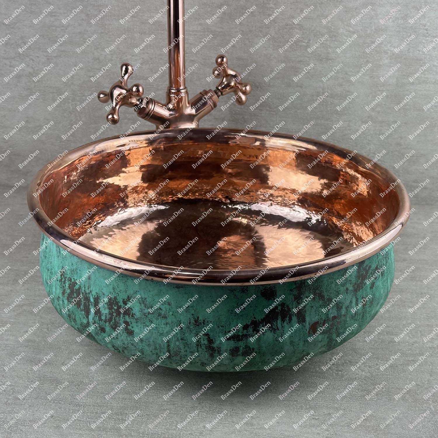 Oxidized Round Copper Vessel Sink with Faucet – Handmade Bathroom Basin