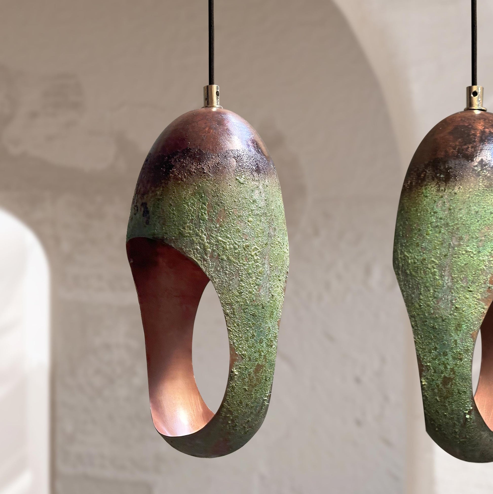 Set of 2 Handcrafted Green Patina Oval Copper Pendant Lights