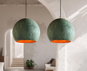 Two Green Patina Copper Pendant Lights – Oxidized Globe Farmhouse Kitchen Island Lighting