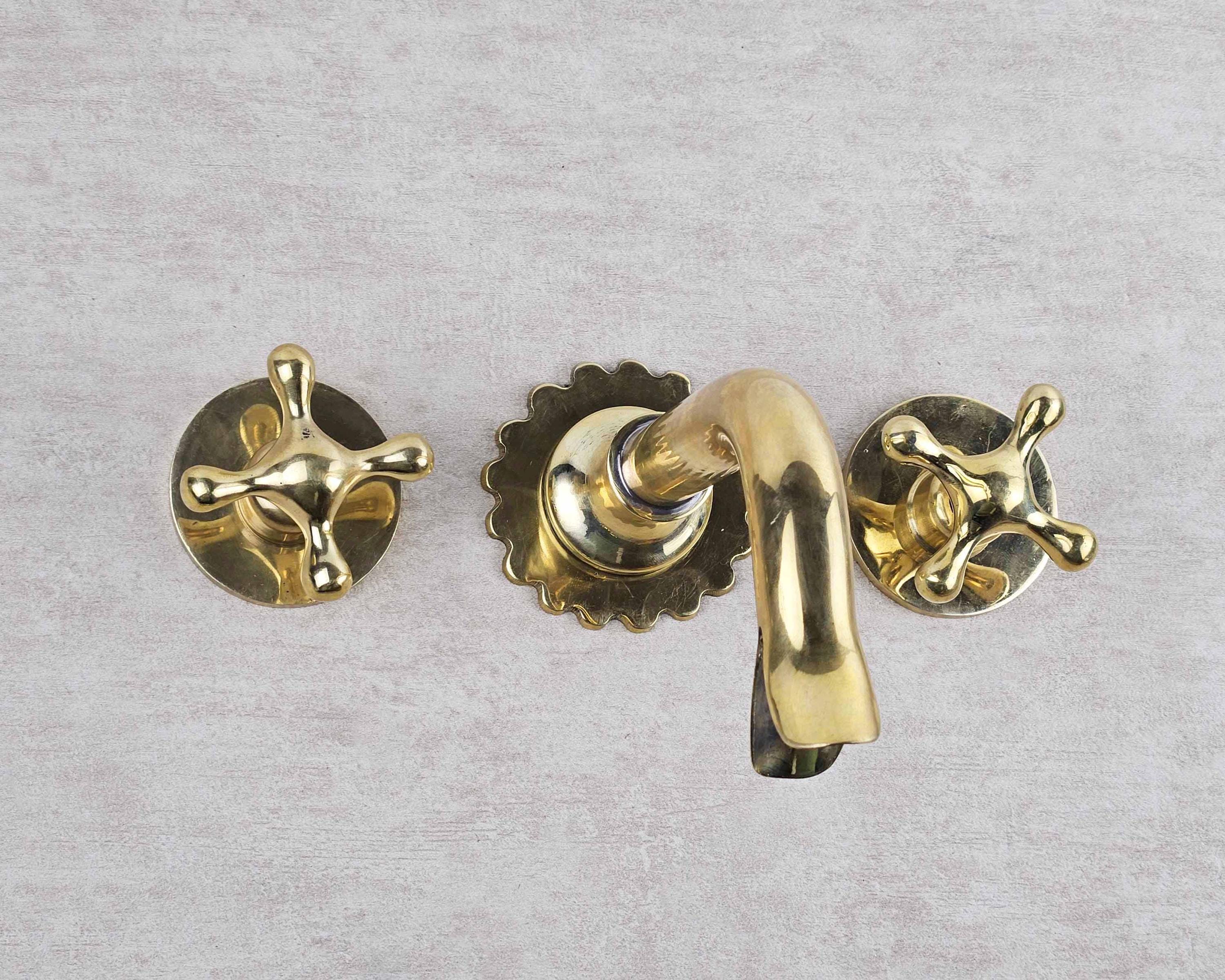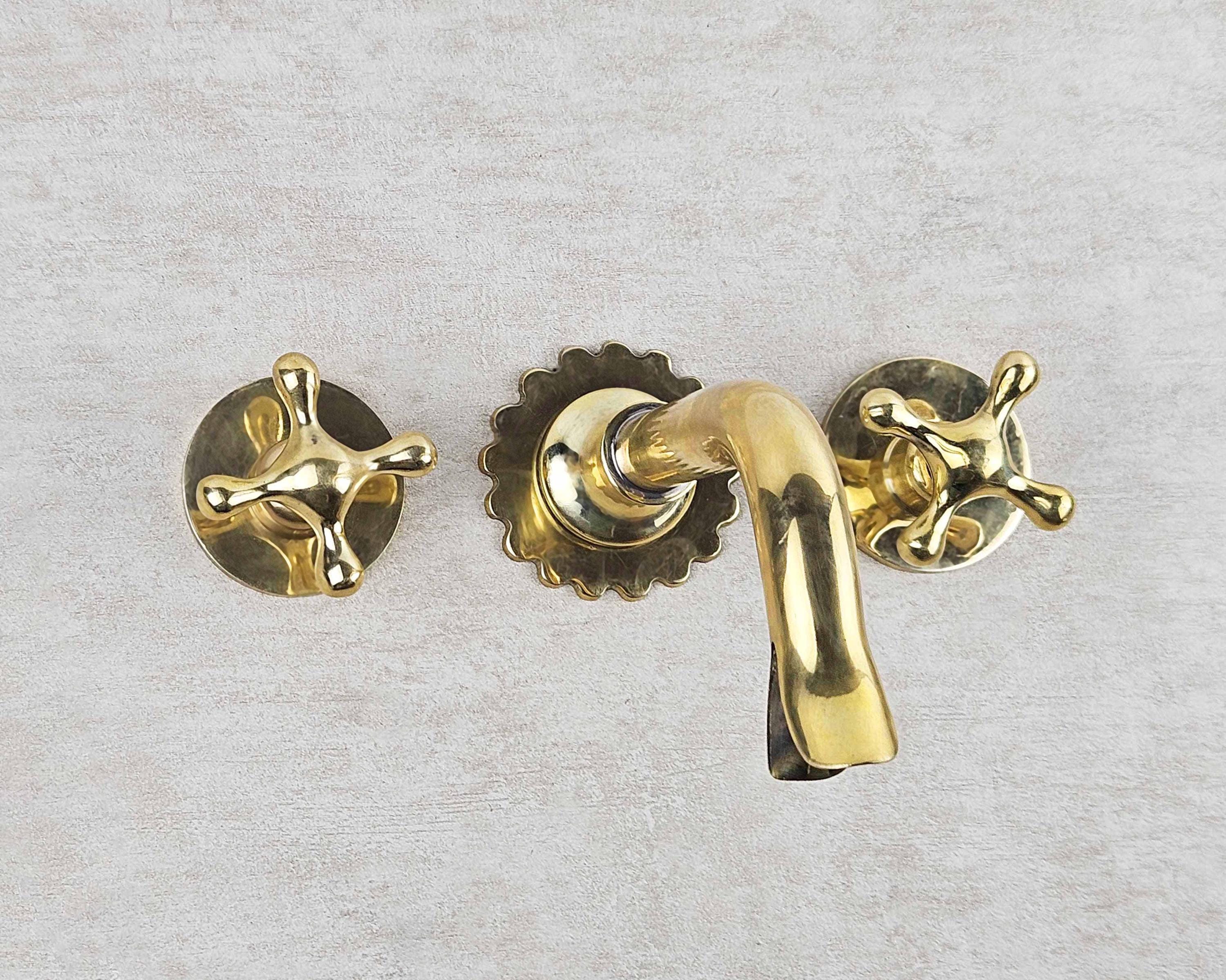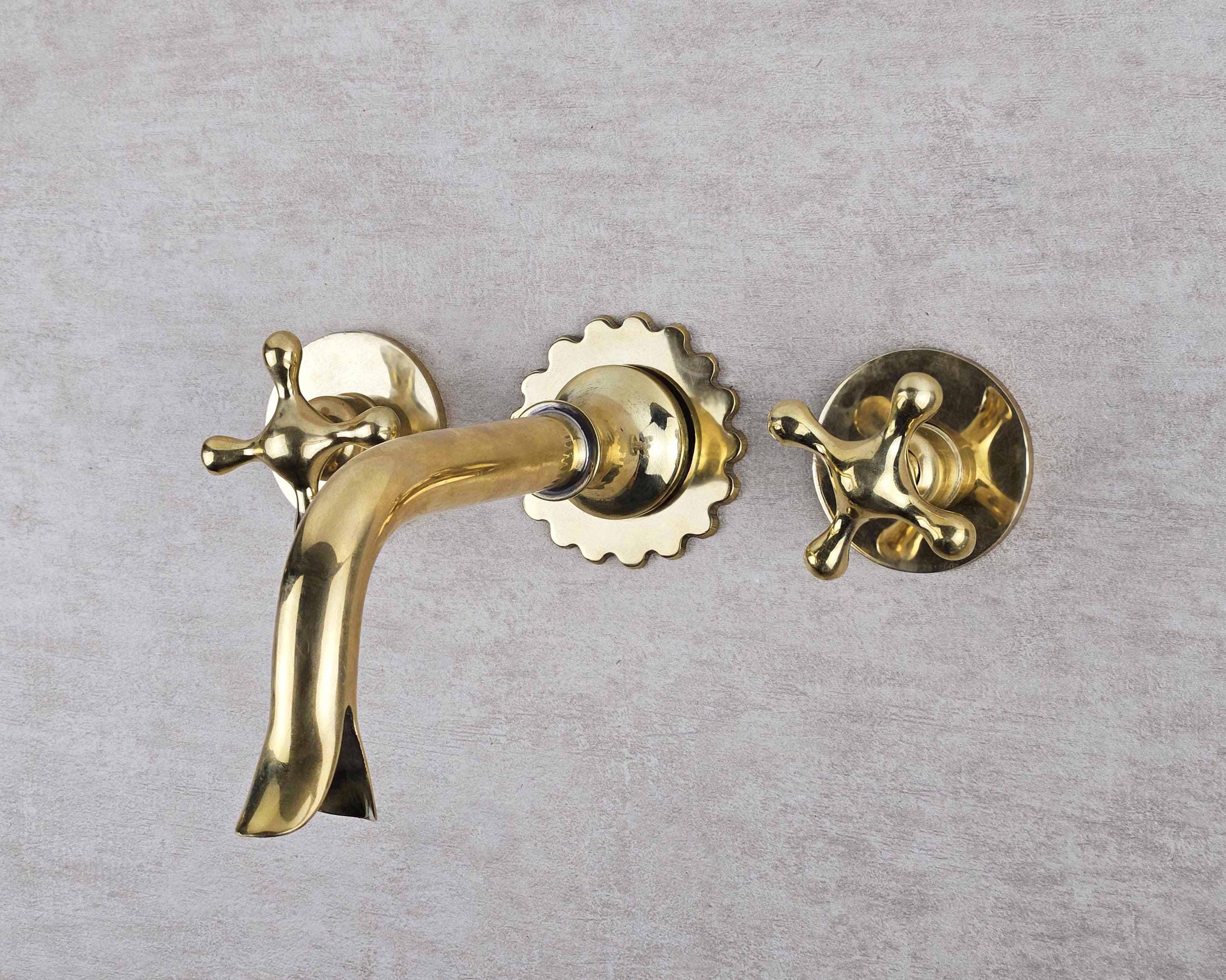 Unlacquered Brass Bathroom Sink Faucet, Wall Mount Brass Bath Faucet with Cross Handles
